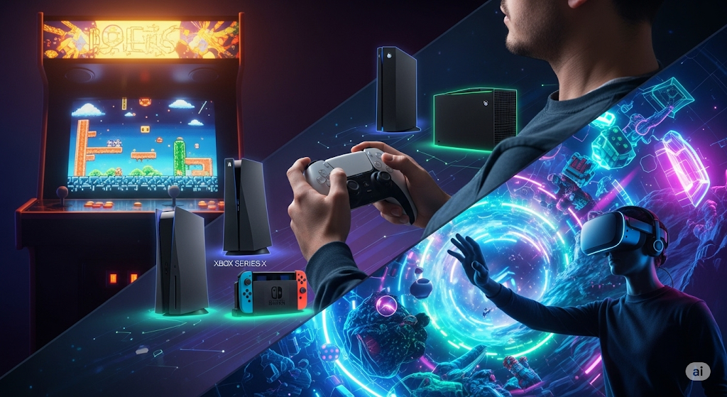Thumbnail created for my podcast, the episode was about the progression of gaming technology through the years using Gemini