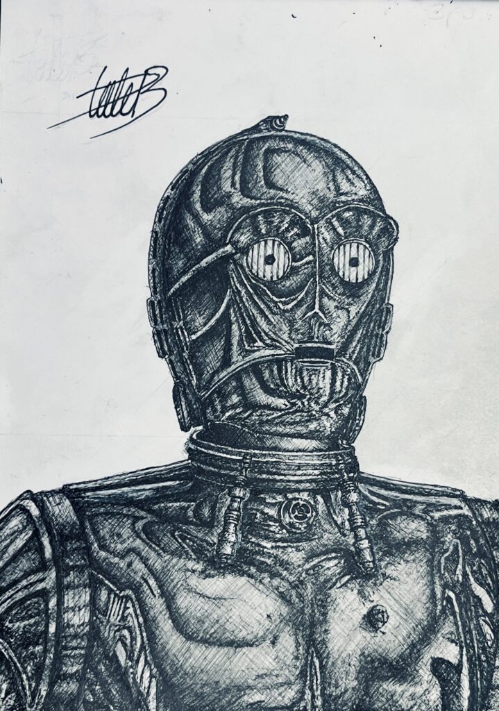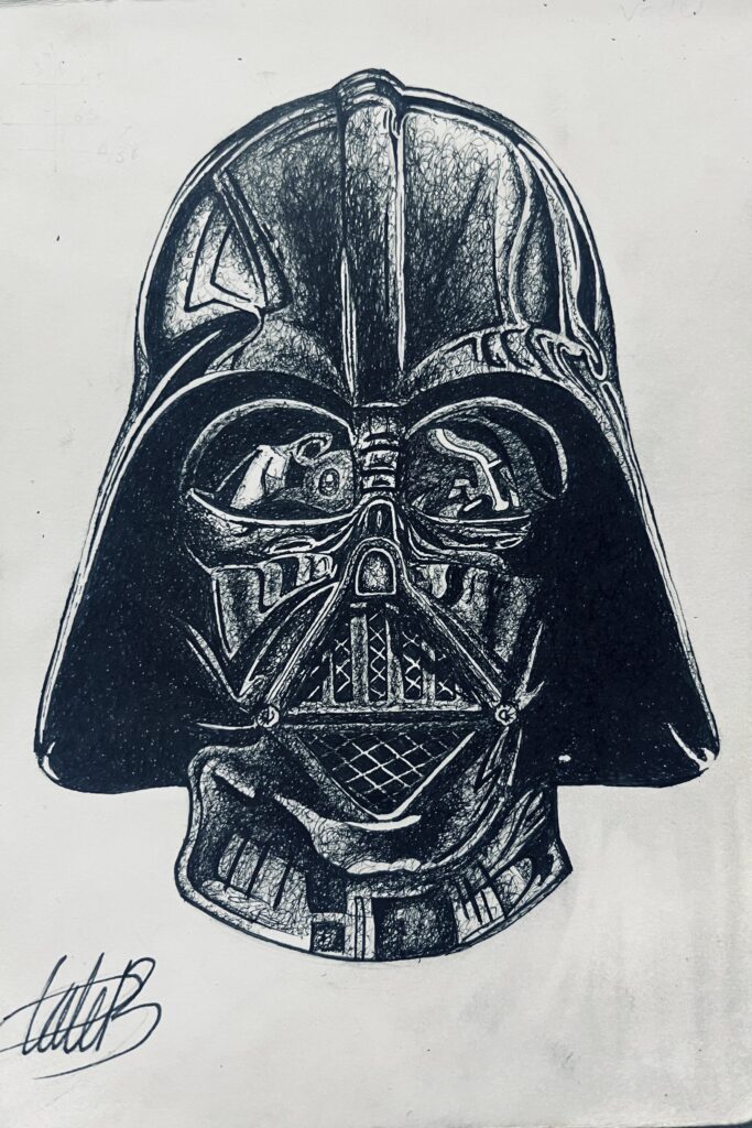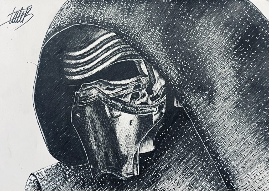Kylo Ren: Using hatching for shading and white acrylic pen for detailing (particularly on the hood)